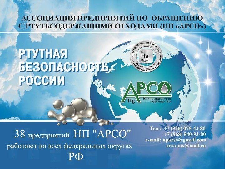 УЧРЕДИТЕЛИ Российские лицензированные специализированные предприятия, работающие более 20 лет на рынке обращения с ртутьсодержащими и другими опасными отходами НТС НП «АРСО» Члены НТС Доктора и Кандидаты Технических Наук, Эксперты-консультанты ведут научно-исследовательскую, изобретательскую и научно-методическую деятельность, участвуют в Федеральных научно-технических Программах и в Международных Конференциях