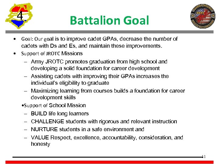 4 Battalion Commander • C/ LTC Devon Bodziony • Role in Battalion • Commands the battalion through the proper use of the chain of command within the policy and guidelines set by the SAI. • Sets the standard for the battalion in appearance, attitude, conduct, bearing, discipline, and performance. • Role in Continuous Improvement Project: • Assign roles to implement an effective project • Overall oversight of project • Describe the Battalion goal and how it relates to the JROTC and HCPSS goals/missions. 10