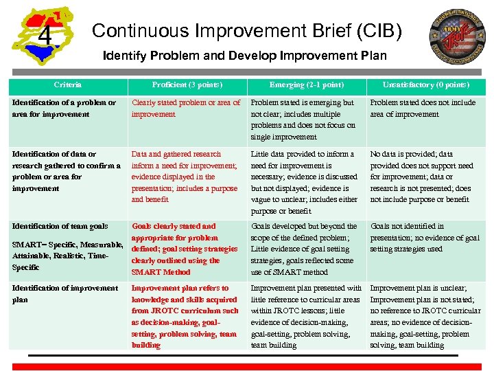4 Continuous Improvement Brief (CIB) Identify Problem and Develop Improvement Plan Criteria Proficient (3 points) Emerging (2 -1 point) Unsatisfactory (0 points) Identification of a problem or area for improvement Clearly stated problem or area of improvement Problem stated is emerging but not clear; includes multiple problems and does not focus on single improvement Problem stated does not include area of improvement Identification of data or research gathered to confirm a problem or area for improvement Data and gathered research inform a need for improvement; evidence displayed in the presentation; includes a purpose and benefit Little data provided to inform a need for improvement is necessary; evidence is discussed but not displayed; evidence is vague to unclear; includes either purpose or benefit No data is provided; data provided does not support need for improvement; data or research is not presented; does not include purpose or benefit Goals clearly stated and appropriate for problem SMART= Specific, Measurable, defined; goal setting strategies Attainable, Realistic, Timeclearly outlined using the Specific SMART Method Goals developed but beyond the scope of the defined problem; Little evidence of goal setting strategies, goals reflected some use of SMART method Goals not identified in presentation; no evidence of goal setting strategies used Identification of improvement plan Improvement plan presented with little reference to curricular areas within JROTC lessons; little evidence of decision-making, goal-setting, problem solving, team building Improvement plan is unclear; Improvement plan is not stated; no reference to JROTC curricular areas; no evidence of decisionmaking, goal-setting, problem solving, team building Identification of team goals Improvement plan refers to knowledge and skills acquired from JROTC curriculum such as decision-making, goalsetting, problem solving, team building