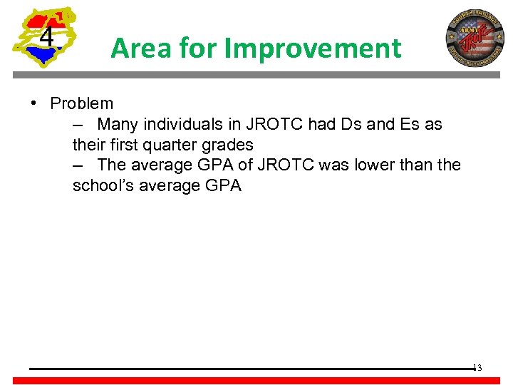 4 Area for Improvement • Problem – Many individuals in JROTC had Ds and Es as their first quarter grades – The average GPA of JROTC was lower than the school’s average GPA 13