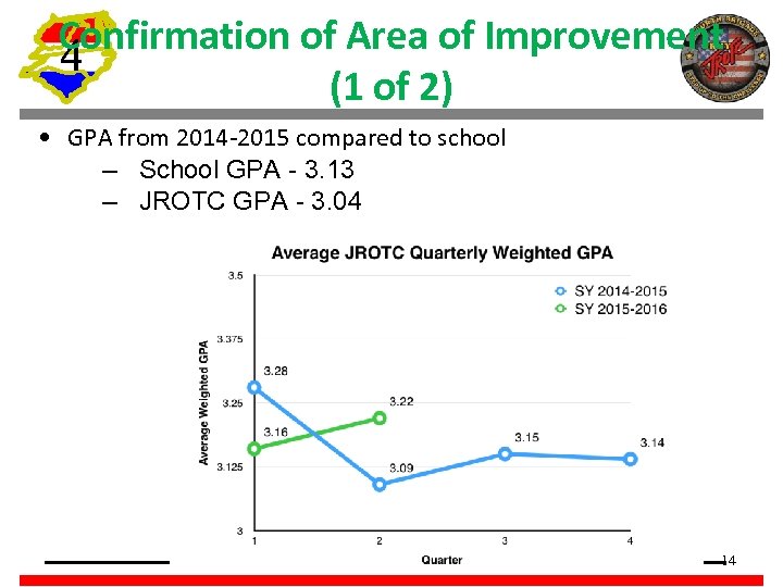 Confirmation of Area of Improvement 4 (1 of 2) • GPA from 2014 -2015 compared to school – School GPA - 3. 13 – JROTC GPA - 3. 04 14