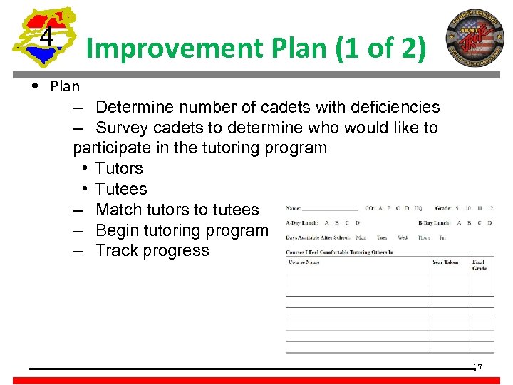 4 Improvement Plan (1 of 2) • Plan – Determine number of cadets with deficiencies – Survey cadets to determine who would like to participate in the tutoring program • Tutors • Tutees – Match tutors to tutees – Begin tutoring program – Track progress 17