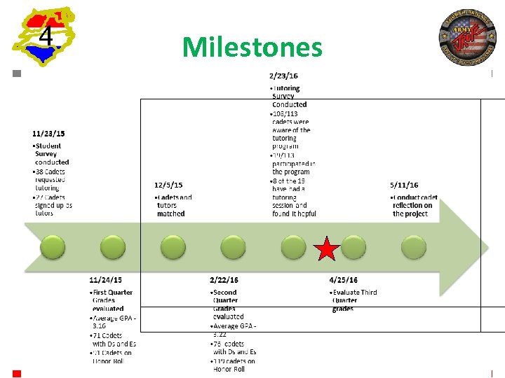 4 Team Goals • Goal – Decrease number of cadets with final grades of Ds or Es by at least ⅓ (71 → 47) – Have the average JROTC GPA meet or exceed the average school GPA. (3. 13) • SMART Method – Specific - Goal is tailored to GPA increases and number of Ds and Es – Measurable - GPAs are measured each quarter and at the end of the year – Attainable - Reducing number of cadets with Ds and Es by ⅓ is manageable – Realistic - Requires an average BN GPA increase by. 1 – Time-Specific - Limited to this school year in order to assess and reevaluate our project while the current staff is in place 16