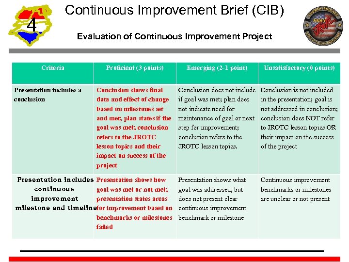 Continuous Improvement Brief (CIB) 4 Evaluation of Continuous Improvement Project Criteria Presentation includes a conclusion Proficient (3 points) Emerging (2 -1 point) Unsatisfactory (0 points) Conclusion shows final data and effect of change based on milestones set and met; plan states if the goal was met; conclusion refers to the JROTC lesson topics and their impact on success of the project Conclusion does not include if goal was met; plan does not indicate need for maintenance of goal or next step for improvement; conclusion refers to the JROTC lesson topics. Conclusion is not included in the presentation; goal is not addressed in conclusion; conclusion does NOT refer to JROTC lesson topics OR their impact on the success of the project Presentation shows what goal was addressed, but does not present clear continuous improvement benchmark or milestone Continuous improvement benchmarks or milestones are unclear or not present Presentation includes Presentation shows how continuous goal was met or not met; improvement presentation states areas milestone and timelinefor improvement based on benchmarks or milestones failed