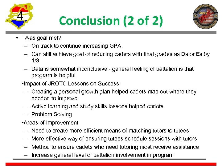 4 • Conclusion (2 of 2) Was goal met? – On track to continue increasing GPA – Can still achieve goal of reducing cadets with final grades as Ds or Es by 1/3 – Data is somewhat inconclusive - general feeling of battalion is that program is helpful • Impact of JROTC Lessons on Success – Creating a personal growth plan helped cadets map out where they needed to improve – Active learning and study skills lessons helped cadets – Problem Solving • Areas of Improvement – Need to create more efficient means of matching tutors to tutees – More effective way of ensuring tutees schedule sessions with tutors – Method to ensure cadets who need tutoring most receive assistance – Increase general level of battalion involvement in program