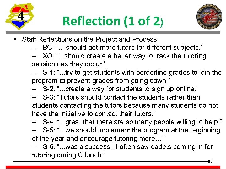 4 Reflection (1 of 2) • Staff Reflections on the Project and Process – BC: “. . . should get more tutors for different subjects. ” – XO: “. . . should create a better way to track the tutoring sessions as they occur. ” – S-1: “. . . try to get students with borderline grades to join the program to prevent grades from going down. ” – S-2: “. . . create a way for students to sign up online. ” – S-3: “Tutors should contact the students rather than students contacting the tutors because many students do not have the initiative to contact their tutors. ” – S-4: “. . . great there are so many people willing to help. ” – S-5: “. . . we should implement the program at the beginning of the year and encourage tutoring more…” – S-6: “. . . was a success. . . I often saw cadets coming in for tutoring during C lunch. ” 25