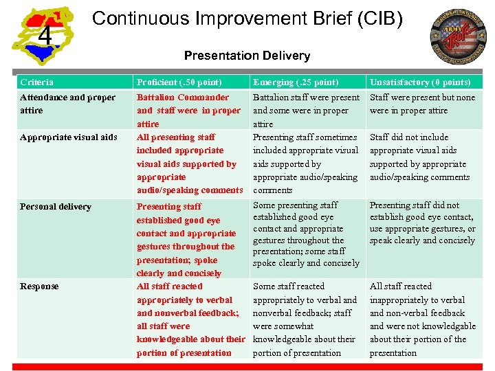 4 Continuous Improvement Brief (CIB) Presentation Delivery Criteria Proficient (. 50 point) Emerging (. 25 point) Unsatisfactory (0 points) Attendance and proper attire Battalion Commander and staff were in proper attire All presenting staff included appropriate visual aids supported by appropriate audio/speaking comments Battalion staff were present and some were in proper attire Presenting staff sometimes included appropriate visual aids supported by appropriate audio/speaking comments Staff were present but none were in proper attire Presenting staff established good eye contact and appropriate gestures throughout the presentation; spoke clearly and concisely All staff reacted appropriately to verbal and nonverbal feedback; all staff were knowledgeable about their portion of presentation Some presenting staff established good eye contact and appropriate gestures throughout the presentation; some staff spoke clearly and concisely Presenting staff did not establish good eye contact, use appropriate gestures, or speak clearly and concisely Some staff reacted appropriately to verbal and nonverbal feedback; staff were somewhat knowledgeable about their portion of presentation All staff reacted inappropriately to verbal and non-verbal feedback and were not knowledgable about their portion of the presentation Appropriate visual aids Personal delivery Response Staff did not include appropriate visual aids supported by appropriate audio/speaking comments