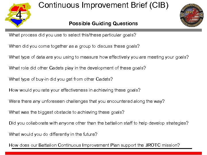 Continuous Improvement Brief (CIB) 4 The following outlines the Continuous Improvement Process for Leadership: Plan At the start of a new school year, Cadet staff plans their activities for the year, assuring that each activity supports the JROTC mission, vision, program outcomes and their Battalion goals. If they are not addressing one of the program goals with an activity, they may need to plan something else or rethink the importance of the goal in the first place.