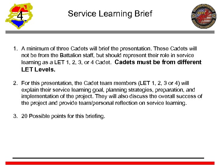 4 Service Learning Brief 1. A minimum of three Cadets will brief the presentation. These Cadets will not be from the Battalion staff, but should represent their role in service learning as a LET 1, 2, 3, or 4 Cadets must be from different LET Levels. 2. For this presentation, the Cadet team members (LET 1, 2, 3 or 4) will explain their service learning goal, planning strategies, preparation, and implementation of the project. They will also discuss the overall success of the project and provide team/personal reflection on service learning. 3. 20 Possible points for this briefing.