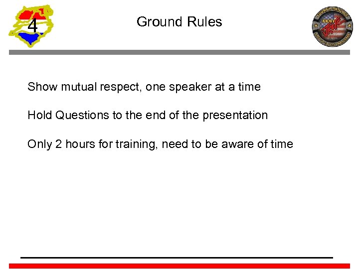 4 Ground Rules Show mutual respect, one speaker at a time Hold Questions to the end of the presentation Only 2 hours for training, need to be aware of time