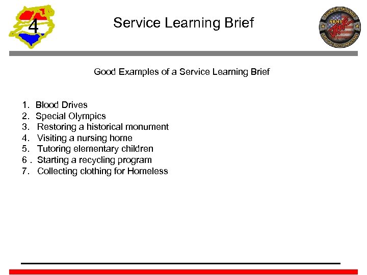 4 Service Learning Brief Good Examples of a Service Learning Brief 1. 2. 3. 4. 5. 6. 7. Blood Drives Special Olympics Restoring a historical monument Visiting a nursing home Tutoring elementary children Starting a recycling program Collecting clothing for Homeless