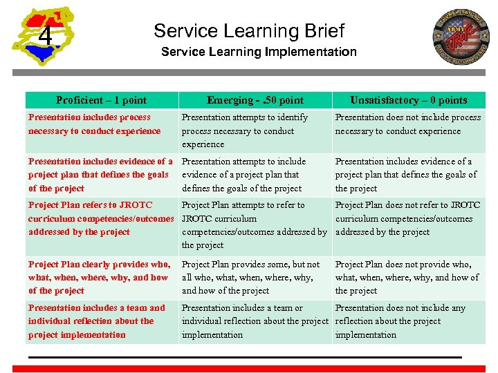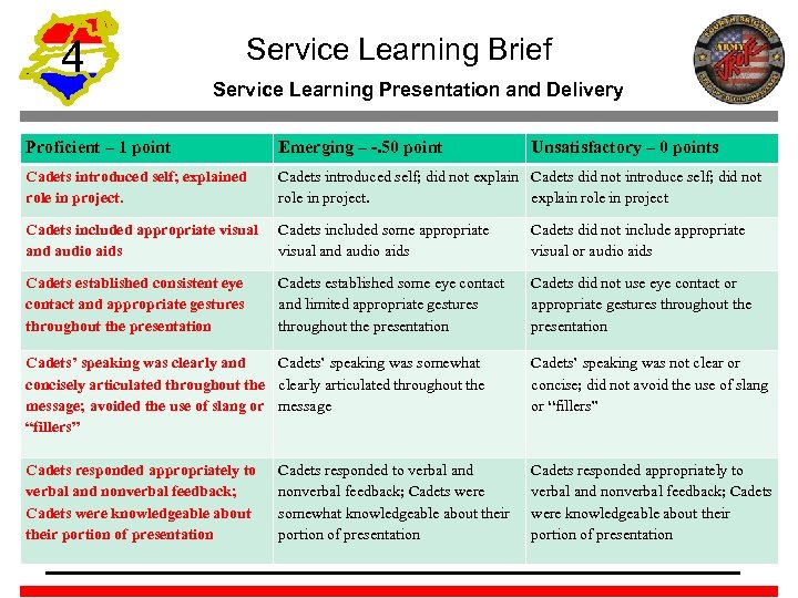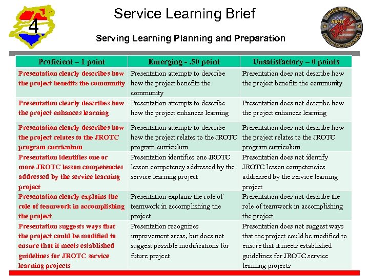 4 Service Learning Brief Serving Learning Planning and Preparation Proficient – 1 point Emerging -. 50 point Unsatisfactory – 0 points Presentation clearly describes how Presentation attempts to describe the project benefits the community how the project benefits the community Presentation clearly describes how Presentation attempts to describe the project enhances learning how the project enhances learning Presentation does not describe how the project benefits the community Presentation clearly describes how the project relates to the JROTC program curriculum Presentation identifies one or more JROTC lesson competencies addressed by the service learning project Presentation clearly explains the role of teamwork in accomplishing the project Presentation suggests ways that the project could be modified to ensure that it meets established guidelines for JROTC service learning projects Presentation does not describe how the project relates to the JROTC program curriculum Presentation does not identify JROTC lesson competencies addressed by the service learning project Presentation does not describe the role of teamwork in accomplishing the project Presentation does not suggest ways that the project could be modified to ensure that it meets established guidelines for JROTC service learning projects Presentation attempts to describe how the project relates to the JROTC program curriculum Presentation identifies one JROTC lesson competency addressed by the service learning project Presentation explains the role of teamwork in accomplishing the project Presentation recognizes improvement areas, but does not suggest possible modifications for future project Presentation does not describe how the project enhances learning