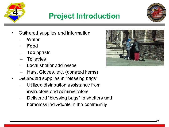 4 • • Project Introduction Gathered supplies and information – Water – Food – Toothpaste – Toiletries – Local shelter addresses – Hats, Gloves, etc. (donated items) Distributed supplies in “blessing bags” – Utilized distribution assistance from instructors and administrators – Delivered “blessing bags” to shelters and homeless individuals in the community 32