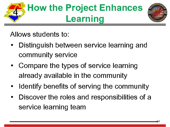 How the Project Enhances 4 Learning Allows students to: • Distinguish between service learning and community service • Compare the types of service learning already available in the community • Identify benefits of serving the community • Discover the roles and responsibilities of a service learning team 34