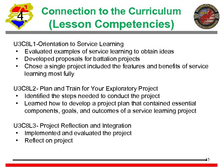 4 Connection to the Curriculum (Lesson Competencies) U 3 C 8 L 1 -Orientation to Service Learning • Evaluated examples of service learning to obtain ideas • Developed proposals for battalion projects • Chose a single project included the features and benefits of service learning most fully U 3 C 8 L 2 - Plan and Train for Your Exploratory Project • Identified the steps needed to conduct the project • Learned how to develop a project plan that contained essential components, goals, and outcomes of a service learning project U 3 C 8 L 3 - Project Reflection and Integration • Implemented and evaluated the project • Reflect on project 35