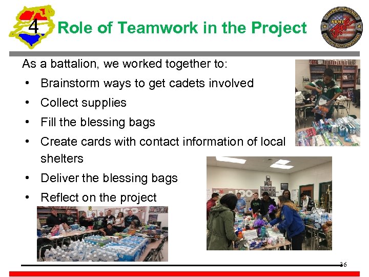 4 Role of Teamwork in the Project As a battalion, we worked together to: • Brainstorm ways to get cadets involved • Collect supplies • Fill the blessing bags • Create cards with contact information of local shelters • Deliver the blessing bags • Reflect on the project 36