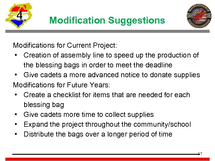 4 Modification Suggestions Modifications for Current Project: • Creation of assembly line to speed up the production of the blessing bags in order to meet the deadline • Give cadets a more advanced notice to donate supplies Modifications for Future Years: • Create a checklist for items that are needed for each blessing bag • Give cadets more time to collect supplies • Expand the project throughout the community/school • Distribute the bags over a longer period of time 37