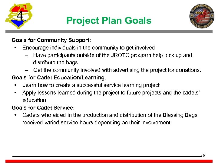 4 Project Plan Goals for Community Support: • Encourage individuals in the community to get involved – Have participants outside of the JROTC program help pick up and distribute the bags. – Get the community involved with advertising the project for donations. Goals for Cadet Education/Learning: • Learn how to create a successful service learning project • Apply lessons learned during the project to future projects and the cadets’ education Goals for Cadet Service: • Cadets who aided in the production and distribution of the Blessing Bags received varied service hours depending on their involvement 40