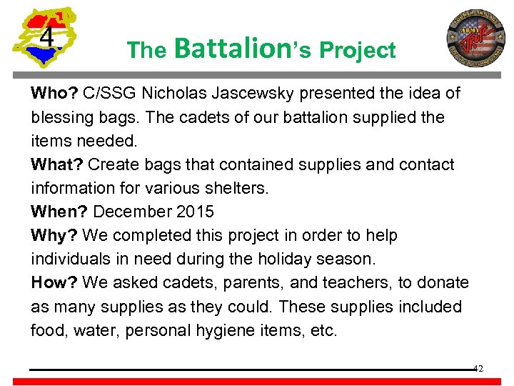 4 The Battalion’s Project Who? C/SSG Nicholas Jascewsky presented the idea of blessing bags. The cadets of our battalion supplied the items needed. What? Create bags that contained supplies and contact information for various shelters. When? December 2015 Why? We completed this project in order to help individuals in need during the holiday season. How? We asked cadets, parents, and teachers, to donate as many supplies as they could. These supplies included food, water, personal hygiene items, etc. 42