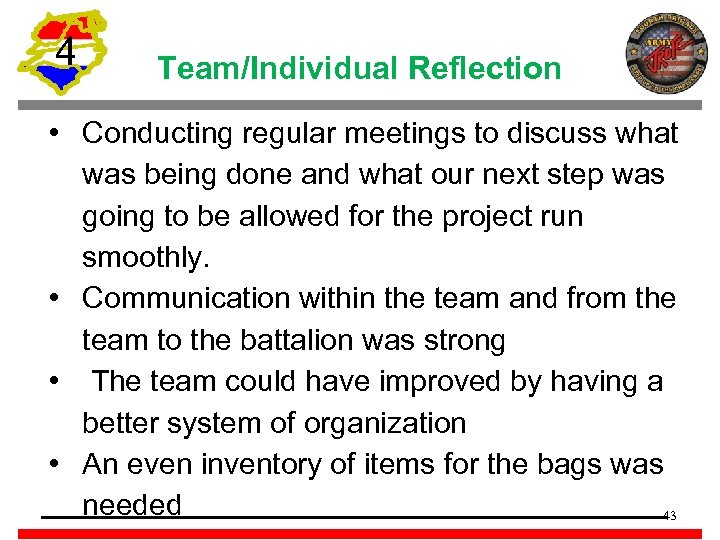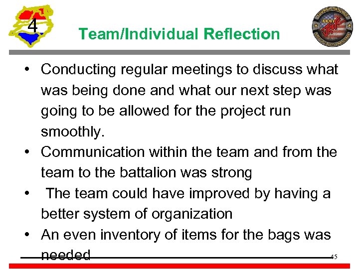 4 Team/Individual Reflection • Conducting regular meetings to discuss what was being done and what our next step was going to be allowed for the project run smoothly. • Communication within the team and from the team to the battalion was strong • The team could have improved by having a better system of organization • An even inventory of items for the bags was needed 43