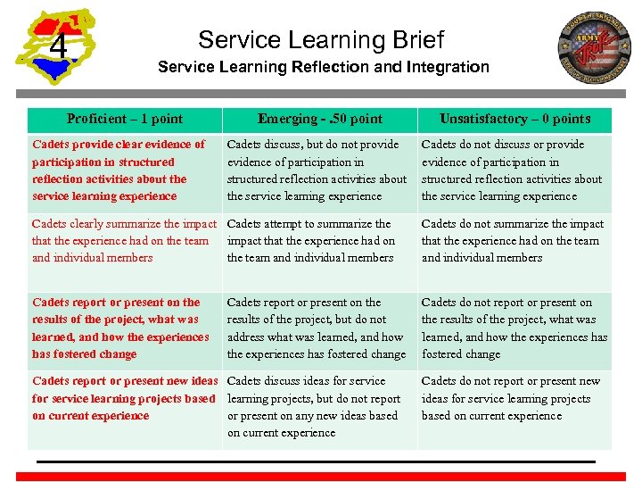 4 Service Learning Brief Service Learning Reflection and Integration Proficient – 1 point Cadets provide clear evidence of participation in structured reflection activities about the service learning experience Emerging -. 50 point Unsatisfactory – 0 points Cadets discuss, but do not provide evidence of participation in structured reflection activities about the service learning experience Cadets do not discuss or provide evidence of participation in structured reflection activities about the service learning experience Cadets clearly summarize the impact Cadets attempt to summarize that the experience had on the team impact that the experience had on and individual members the team and individual members Cadets do not summarize the impact that the experience had on the team and individual members Cadets report or present on the results of the project, what was learned, and how the experiences has fostered change Cadets do not report or present on the results of the project, what was learned, and how the experiences has fostered change Cadets report or present on the results of the project, but do not address what was learned, and how the experiences has fostered change Cadets report or present new ideas Cadets discuss ideas for service learning projects based learning projects, but do not report on current experience or present on any new ideas based on current experience Cadets do not report or present new ideas for service learning projects based on current experience