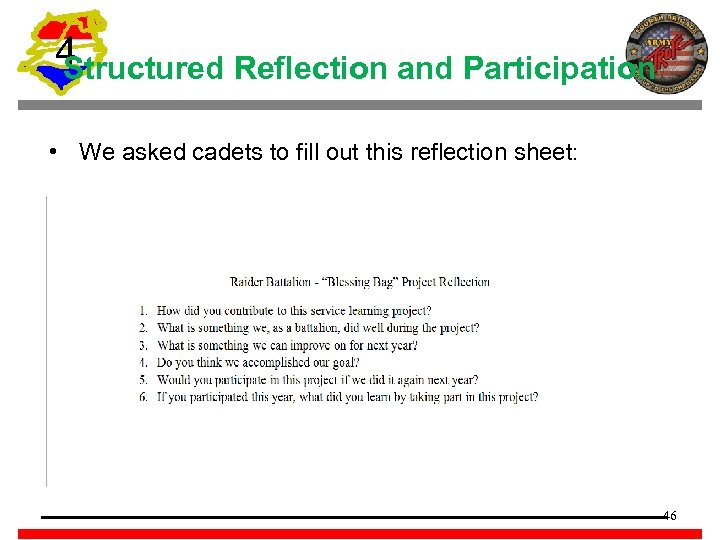 4 Structured Reflection and Participation • We asked cadets to fill out this reflection sheet: 46