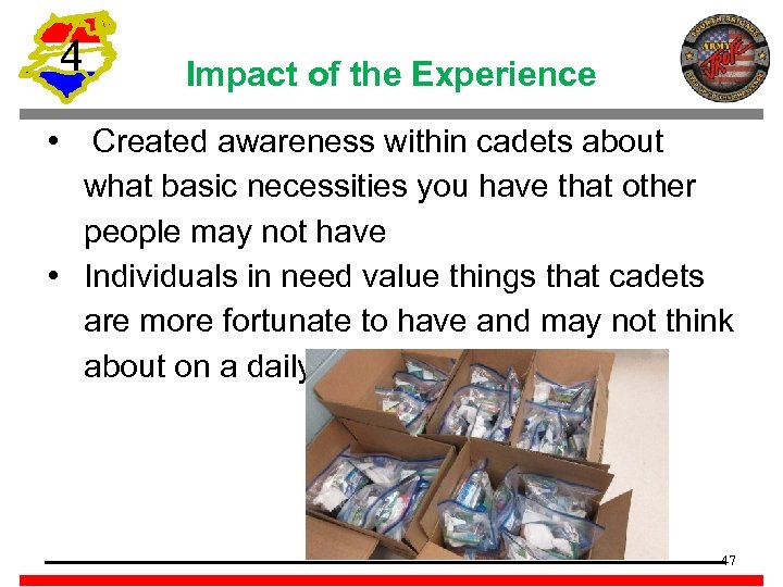 4 Impact of the Experience • Created awareness within cadets about what basic necessities you have that other people may not have • Individuals in need value things that cadets are more fortunate to have and may not think about on a daily basis 47