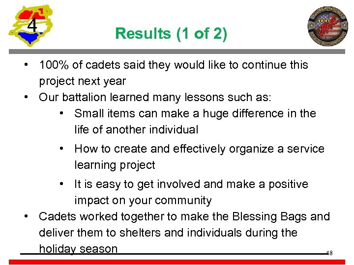 4 Results (1 of 2) • 100% of cadets said they would like to continue this project next year • Our battalion learned many lessons such as: • Small items can make a huge difference in the life of another individual • How to create and effectively organize a service learning project • It is easy to get involved and make a positive impact on your community • Cadets worked together to make the Blessing Bags and deliver them to shelters and individuals during the holiday season 48