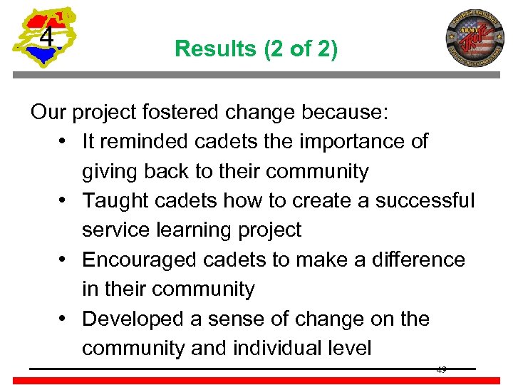 4 Results (2 of 2) Our project fostered change because: • It reminded cadets the importance of giving back to their community • Taught cadets how to create a successful service learning project • Encouraged cadets to make a difference in their community • Developed a sense of change on the community and individual level 49