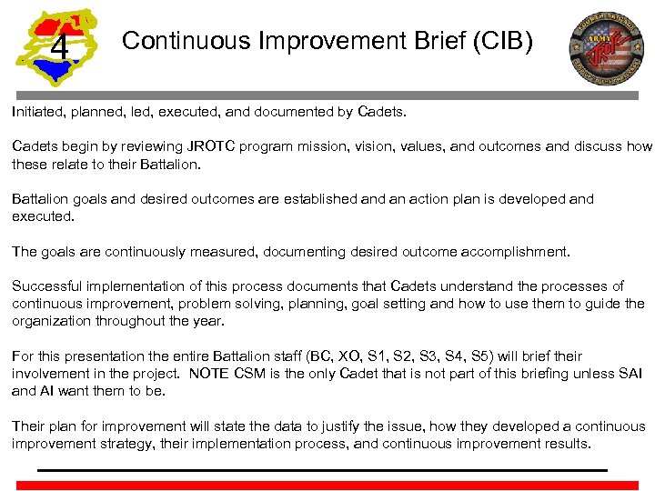 4 Continuous Improvement Brief (CIB) Initiated, planned, led, executed, and documented by Cadets begin by reviewing JROTC program mission, vision, values, and outcomes and discuss how these relate to their Battalion goals and desired outcomes are established an action plan is developed and executed. The goals are continuously measured, documenting desired outcome accomplishment. Successful implementation of this process documents that Cadets understand the processes of continuous improvement, problem solving, planning, goal setting and how to use them to guide the organization throughout the year. For this presentation the entire Battalion staff (BC, XO, S 1, S 2, S 3, S 4, S 5) will brief their involvement in the project. NOTE CSM is the only Cadet that is not part of this briefing unless SAI and AI want them to be. Their plan for improvement will state the data to justify the issue, how they developed a continuous improvement strategy, their implementation process, and continuous improvement results.