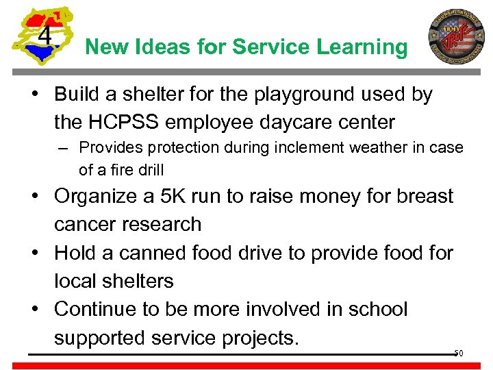4 New Ideas for Service Learning • Build a shelter for the playground used by the HCPSS employee daycare center – Provides protection during inclement weather in case of a fire drill • Organize a 5 K run to raise money for breast cancer research • Hold a canned food drive to provide food for local shelters • Continue to be more involved in school supported service projects. 50