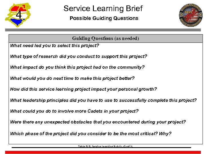 4 Service Learning Brief Possible Guiding Questions (as needed) What need led you to select this project? What type of research did you conduct to support this project? What impact do you think this project had on the community? What would you do next time to make this project better? How did this service learning project impact your personal growth? What leadership principles did you have to use to successfully complete this project? What could you do to involve more Cadets in your project? Were there any unexpected obstacles that you encountered during your project? Which phase of the project did you consider to be the most critical? Why? Table B-3. Service Learning Rubric, Cont’d.