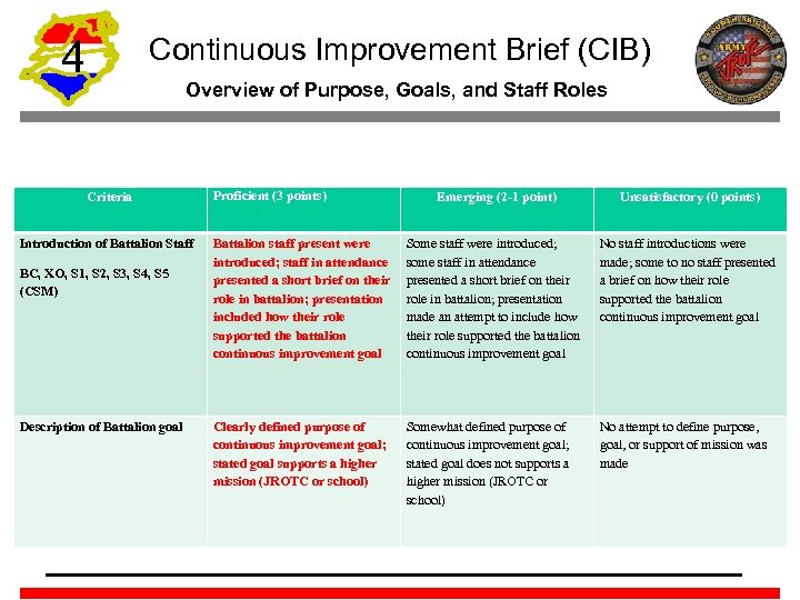 4 Continuous Improvement Brief (CIB) Overview of Purpose, Goals, and Staff Roles Criteria Introduction of Battalion Staff BC, XO, S 1, S 2, S 3, S 4, S 5 (CSM) Description of Battalion goal Proficient (3 points) Emerging (2 -1 point) Unsatisfactory (0 points) Battalion staff present were introduced; staff in attendance presented a short brief on their role in battalion; presentation included how their role supported the battalion continuous improvement goal Some staff were introduced; some staff in attendance presented a short brief on their role in battalion; presentation made an attempt to include how their role supported the battalion continuous improvement goal No staff introductions were made; some to no staff presented a brief on how their role supported the battalion continuous improvement goal Clearly defined purpose of continuous improvement goal; stated goal supports a higher mission (JROTC or school) Somewhat defined purpose of continuous improvement goal; stated goal does not supports a higher mission (JROTC or school) No attempt to define purpose, goal, or support of mission was made