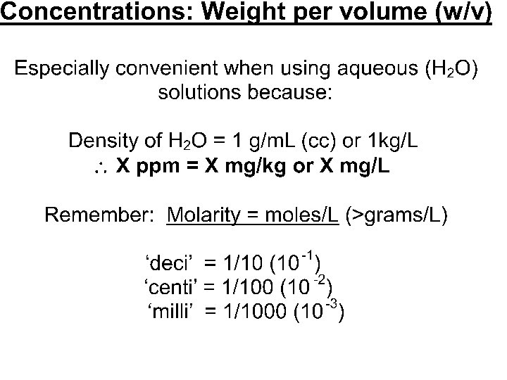 Concentrations of Fat in milk • 1% milk contains 1 gram of fat per 100 grams of milk. • Q: How many grams of fat in a 250 m. L carton of 1% milk? • A: Assume density of milk is 1 gram per m. L. (D=M/V). • Thus the weight of fat in each carton is 250/100 =2. 5 grams • Skim milk contains 0% fat –does it have any calories in it? Yes, since all milk contains protein and carbohydrate.