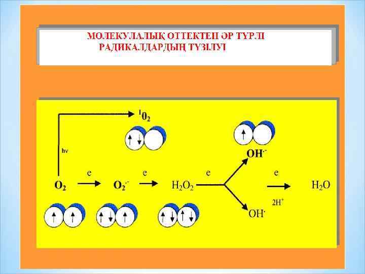 ОТТЕГl. НlҢ АКТИВТl ФОРМАЛАРЫ (ОАФ) O 2*- Супероксид-анион OH- Гидроксил радикалы NО- АЗОТ ОКСИДl. Н РАДИКАЛЫ ж/е т. б. LOO • липопероксирадикал (LOO • ), LO • алкилоксирадикал