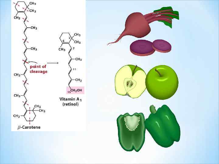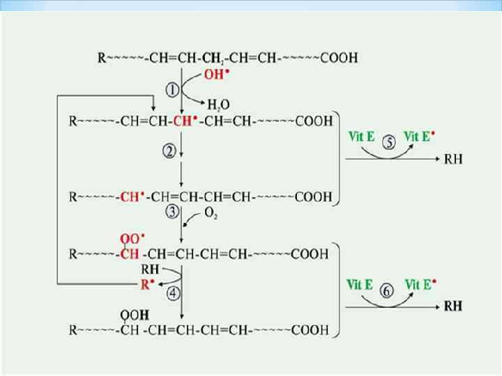 * Р Липид Е Гидроперекись ЖК Витамин Е удаляет пероксильный радикал и превращается сам в СР; аскорбат может восстанавливать витамин Е; энзимы затем удаляют поврежденные ЖК и вставляют новые ЖК, репарируя липиды МЕМБРАН П А Витамин Е Р А Ц И Я