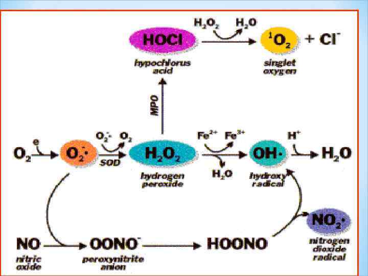 НОСl- гипохлорит-анион O 3 - озон LOOH (ГПЛ)-липидтер гидропероксиді 'O 2 Синглетті оттек H 2 O 2 Сутек асқын тотығы