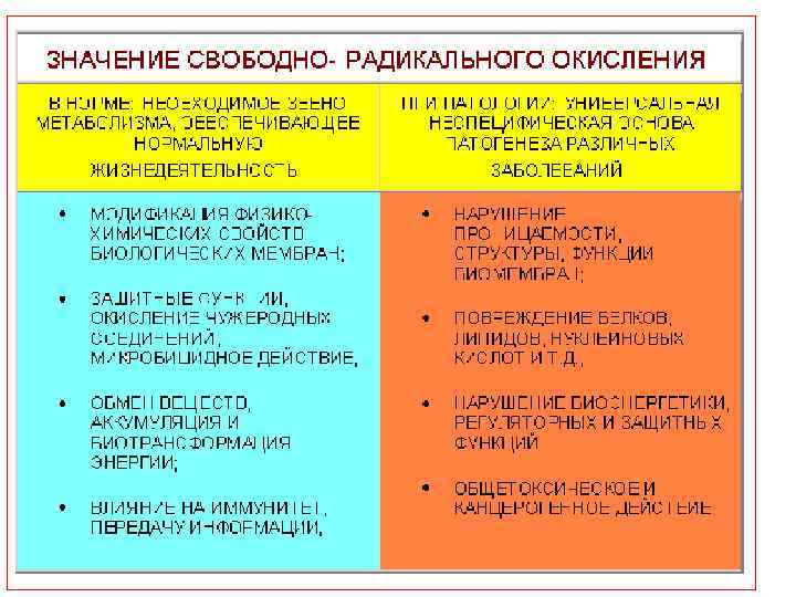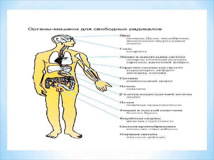 БОС РАДИКАЛДАРДЫҢ (ЛПТ) ЗИЯНЫ vбелоктардың SH тобына әсер етіп , оларың денатурациясын ж/е ферменттердің белсенділігін төмендетеді; v жасуша мембранасының қызметтерін бұзады ; изменяется ионная проницаемость (ионндық каналдар мен ионндық насост бұзылады, мысалы, Са 2+ каналы, Nа, К-АТФазы) v. Ядроға (нуклеин қышқылдарына) әсер етіп жасушаның гендік аппаратын зақымдайды(мутация); v митохондрияға әсер етіп АТФ синтезін бұзады; v усиленная генерация свободных радикалов vкислорода сопровождает болезни Паркинсона, v. Альцгеймера и сам процесс старения , ведет к vпоявлению катаракты