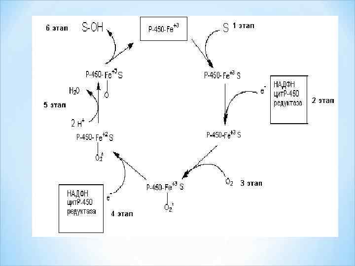 *Реакция микросомаларда, әсіресе залалсыздандыру бауырда жүреді. Мембранамен байланысқан НАДФН 2, ФП же цх. Р 450 мультиферментті жүйе қатысады. *Он не дает клетке энергии *Ферменты: оксигеназы * • диоксигеназы, • монооксигеназы (гидроксилазы). *