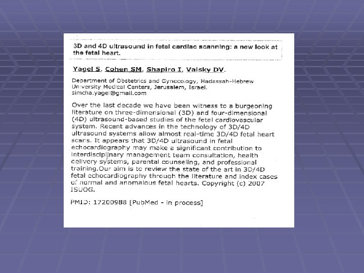 4 D Ultrason § 2015 § Transvajinal 4 D ile fetal kalpte trunkus arteriyosuz tanisi § Hata T, Ultrasound Obstet Gynecol, Nisan 2015 § 4 D ve NT § Kozarov, Med Preg, Nisan 2015 § Standard error, mean value, 0. 027’den 0. 016’a dusus § Daha da erken ve dogru teshis