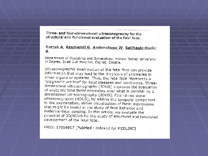 How Useful Is 4 D Ultrasound in Perinatal Medicine § 4 D hakkinda tip literaturunde 2000 senesinden beri su ana kadar yayinlanmis 200 makale/calisma var § § § § Yuz anomalileri Noral tup defektleri Iskelet anomalileri Konjenital kalp defektleri Intrakraniyel anomaliler Davranis Kurjak A et al. How useful is #d and 4 D ultrasound in perinatal medicine. J Perinat Med 2007, 35 (1); 10 -27 Martin J et al. Births; final data for 2002. Natl Vital Stat rep 2003, 52 (10): 1 -113