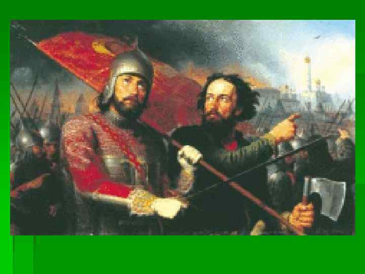 § Подобное неоднократно будет повторяться в русской истории. Простые русские люди, понявшие, что стране угрожает смертельный враг, самоотверженно встают на её защиту. § Пример: Символом верности Родине вечно служит подвиг костромского крестьянина Ивана Сусанина, пожертвовавшего собственной жизнью в борьбе против польских интервентов, заведшего врагов в глухой лес, в болото. (1613 год). По преданию, таким образом он спас жившего тогда в Костроме выбранного на царство Михаила Фёдоровича Романова. Пример самопожертвования. § 1812 год. Народное ополчение – патриоты Смоленска, Бородино. Тарутино. § Массовое партизанское движение, которое сделало пребывание французов в России невыносимым. Ополчение, которое преследовало противника, дав возможность сохранить основные силы русской армии.