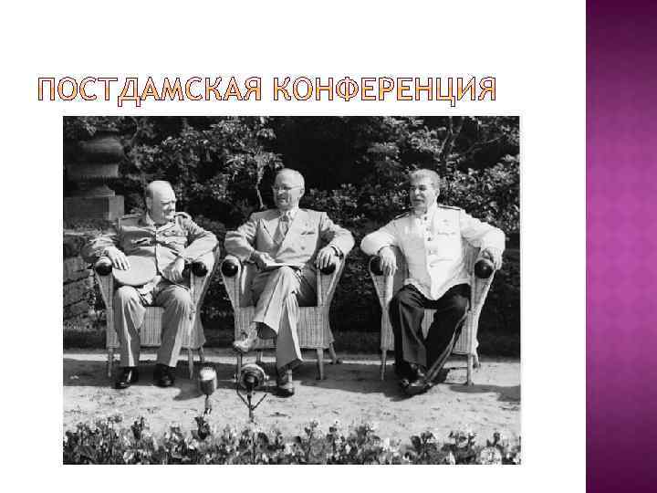 Сроки проведения – 17 июля – 2 августа 1945 гг: Главный вопрос – послевоенное устройство Европы; Участники: СССР (Сталин); США (Трумэн); Великобритания (Черчилль, Эттли) Результаты: конференция признала все территориальные приобретения СССР, кроме Прибалтики; СССР – Восточная Пруссия с Кенигсбергом; установлена западная граница с Польшей по Одеру; демилитаризация и дефашизация Германии, устанавливались репарации с Германией РАЗГРАНИЧЕНЫ СФЕРЫ ВЛИЯНИЯ СССР И СОЮЗНИКОВ