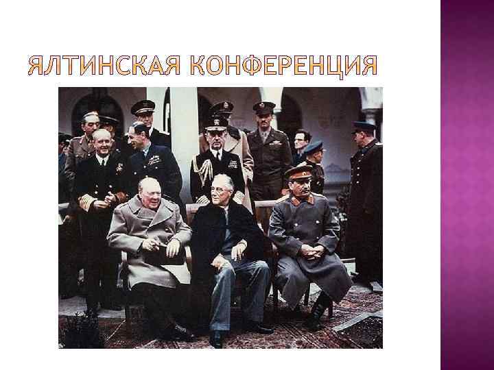 У. Черчилль: открыть на Балканах; Ф. Рузвельт, И. Сталин: в Ю. Франции в мае 1944 г. На самом деле: 6 июня 1944 г. , на с-з Франции, в Нормандии; СССР обещал выступить против Японии, решен вопрос о передачи СССР Клапейды и Кенигсберга.