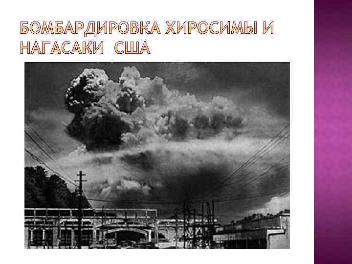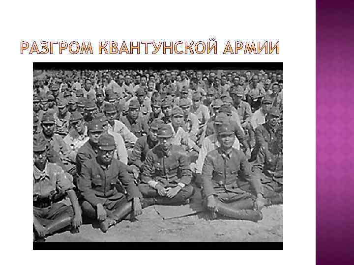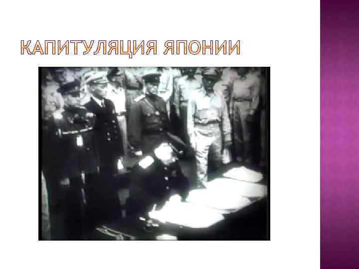 Май 1945 г. – Ялтинская конференция – предложения: Сталина: начать войну против Японии Рузвельт – содействовать передаче СССР ю. Сахалина и Курильских островов 6 и 9 августа 1945 г. – США – атомной бомбардировке Хиросиму и Нагасаки; 9 августа 1945 г. – начал войну СССР (Василевский) СССР разбил Квантунскую армию, акт о капитуляции (Деревянко), кончилась ВМВ