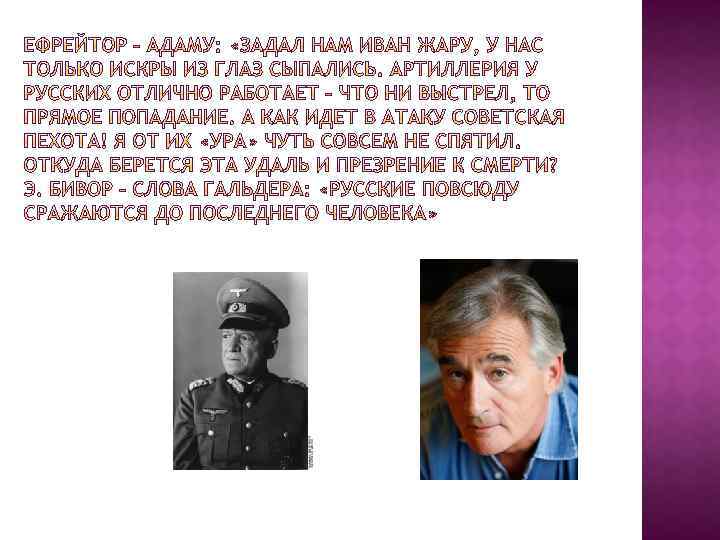 Для русских эта война была отечественной. Отсюда – решимость уничтожить немцев, отвоевать у них родную землю, биться до последней капли крови; 2. Во многих письмах в Германию – боль, недоумение, неприятие того, что происходит. ВЫВОД: ПРИЧИНА ПОБЕДЫ – МОРАЛЬНЫЙ ФАКТОР 1.