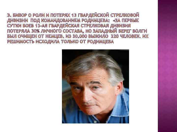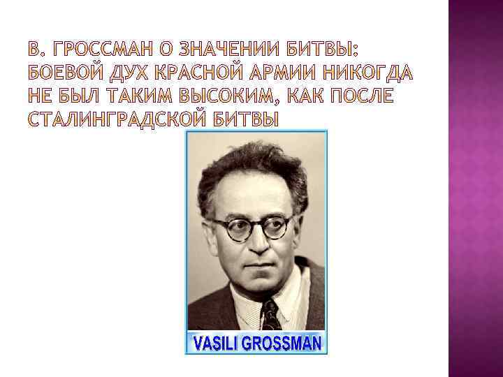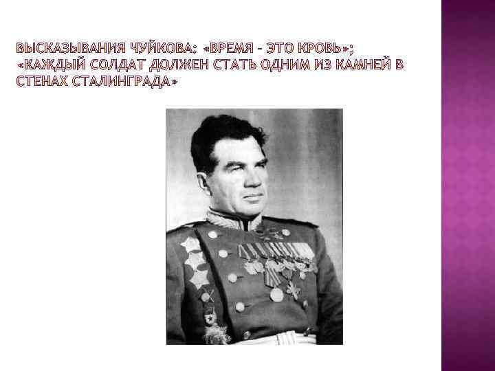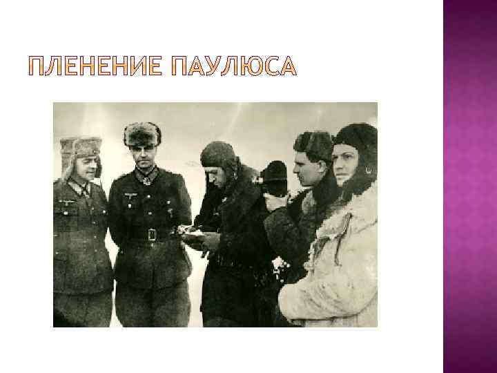Этапы: 1) Оборонительный (17 июля – 18 ноября 1942 г. ); 2) Наступательный (19 ноября 1942 – 2 февраля 1943 г. ) Полководцы: Жуков (зам. Верховного главноком); Василевский (нач. Ген. Штаба); Рокоссовский (ком. Донским фр. ); Еременко (ком. Сталинградским фр); Ватутин (Ю-З фр), Чуйков (62 арм), Шумилов (64 ) Родимцев А. И. (13 Гвардейск. стрелк. дивизия) Причины победы: противник не успел перейти к стратегической обороне, растянутость немецких войск, наиболее боеспособные части – в городе; не было свежих подкреплений