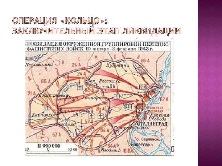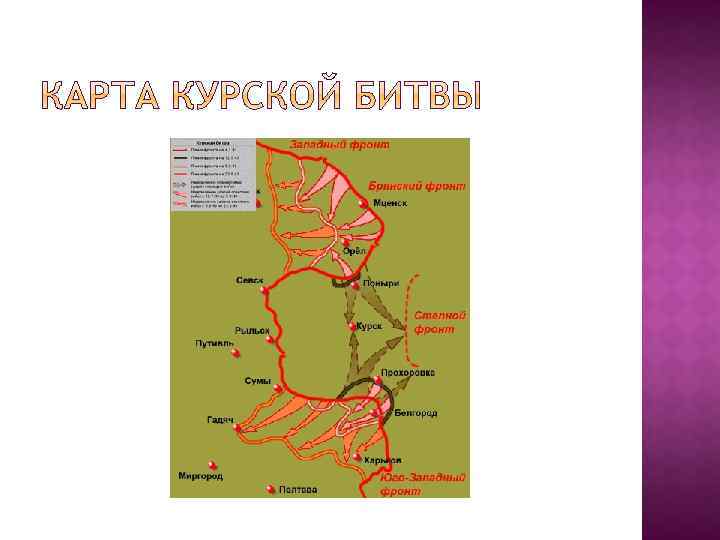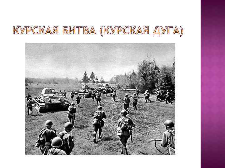 Битвы Дата Значение Сталингр адская 17 июля 1942 г. – 2 февраля 1943 Положила начло коренному перелому в ВОВ. Развернулось наступление по всему фронту. Освобождены: Сев. Кавказ, Воронежская, Сталинградские области, часть Ростовской, Харьковской, Курской областей, Ставропольский и Краснодарский края Курская 5 июля 1943 г. – 23 августа 1943 г. Завершился коренной перелом в ВОВ. Освобождены Орел, Белгород, Харьков, началось освобождение Украины; стратегическая инициатива – в руках К. А.