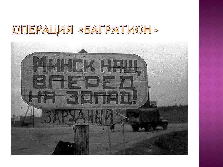 6 ноября 1943 г. – освобожден Киев Зима – весна 1944 г. – бои в Крыму, Молдавии, Прибалтике, Белоруссии, Карелии, Украине Январь 1944 г. – закончилась блокада Ленинграда Июль 1944 г. – операция «Багратион» : разбита группа армии «Центр» , освобождена Белоруссия, К. А. – к границе СССР Весна – осень 1944 г. – сов. войска – на тер. Румынии, Польши, Болгарии, Югославии, Чехословакии, Венгрии