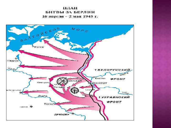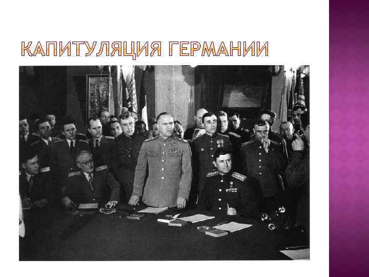 Немецкая оборона прорвана на широком фронте Февраль 1945 г. - советские войска заняли Силезию, март – форсировали Одер 16. 04. 1945 г. – начало Берлинской операции; 25. 04. – замкнулось кольцо окружения, встреча солдат СССР и США на Эльбе 30. 04. 1945 г. – Гитлер и Ева Браун – суицид; 8 – 9 мая 1945 г. – в Карлсхорсте акт капитуляции (от СССР – Жуков)